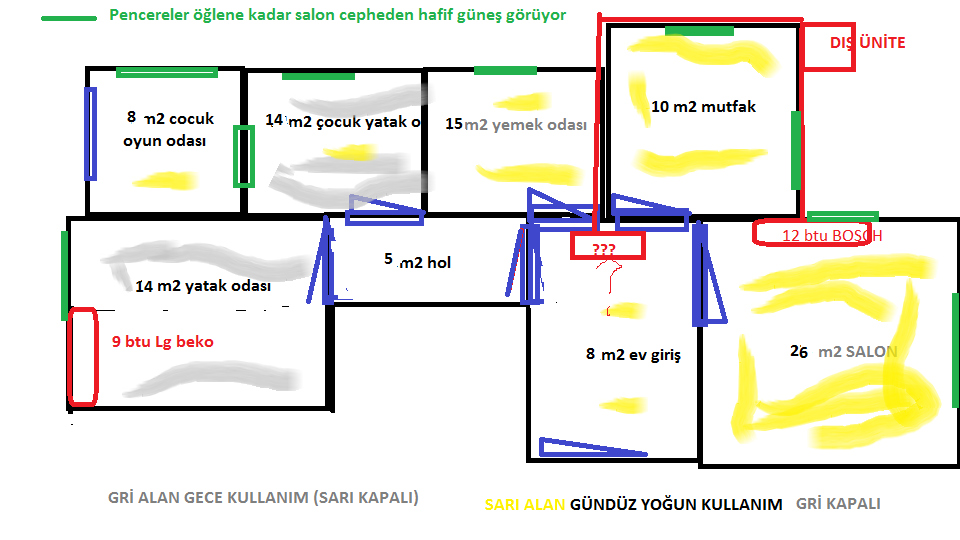 Ben Mersin de ikamet ediyorum. Malumunuz çok sıcak ve nemli bir şehir. Yılın yaklaşık 5 ayı aşırı sıcak ve nemli olup 7/24 kesintisiz klima kullanıyoruz. 2 ay kadarda klimayı soğuk oldukça ısıtmada kullanıyoruz. Ayrıca çocuk odasında UFO tarzı elektrikli ısıtıcı kullanıyoruz. Ev ara kat, kuzey-batı-doğu konumlu, yalıtımsız ama pencereler çiftcamlı, Ev öğleye kadar salondan güneş alıyor, akşam üstü yatak odasından tekrardan güneşle görüşüyoruz.Evin genel kullanımı gündüzleri sarı renkle işaretli olan salon ve mutfak ağırlıklı, bazen çocuk odası, geceleri de griyle işaretli yatak odaları kullanılıyor (diğer tarafların kapıları kapalı). 6 yaşında ikizlerim var, gelecekte ayrı klima isterlerse ayrı, küçük bişi ayarlarız sanıyorum.